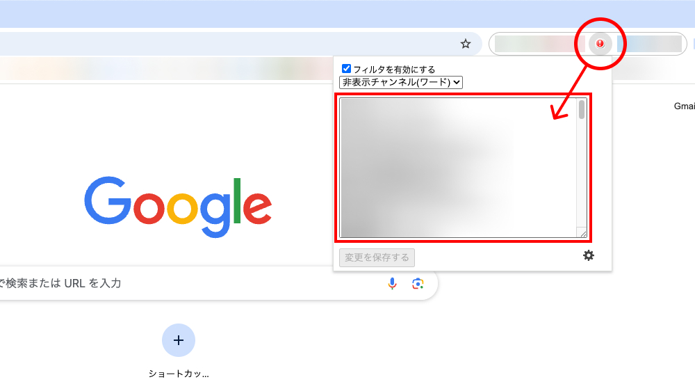 導入したら拡張機能のアイコンをクリックし、その中に反応集動画がつけそうなワードを入れて適用すれば、検索結果から削除できる形になります。